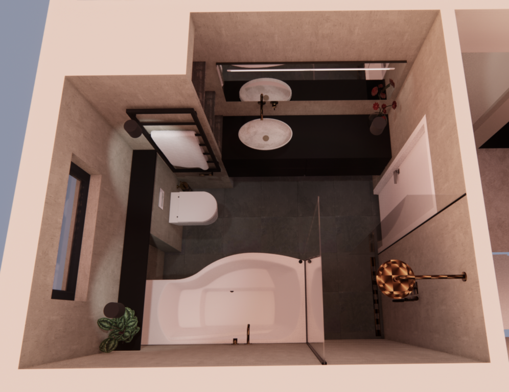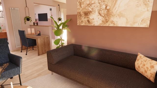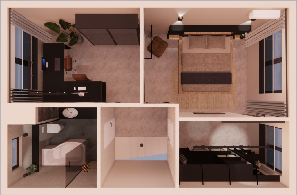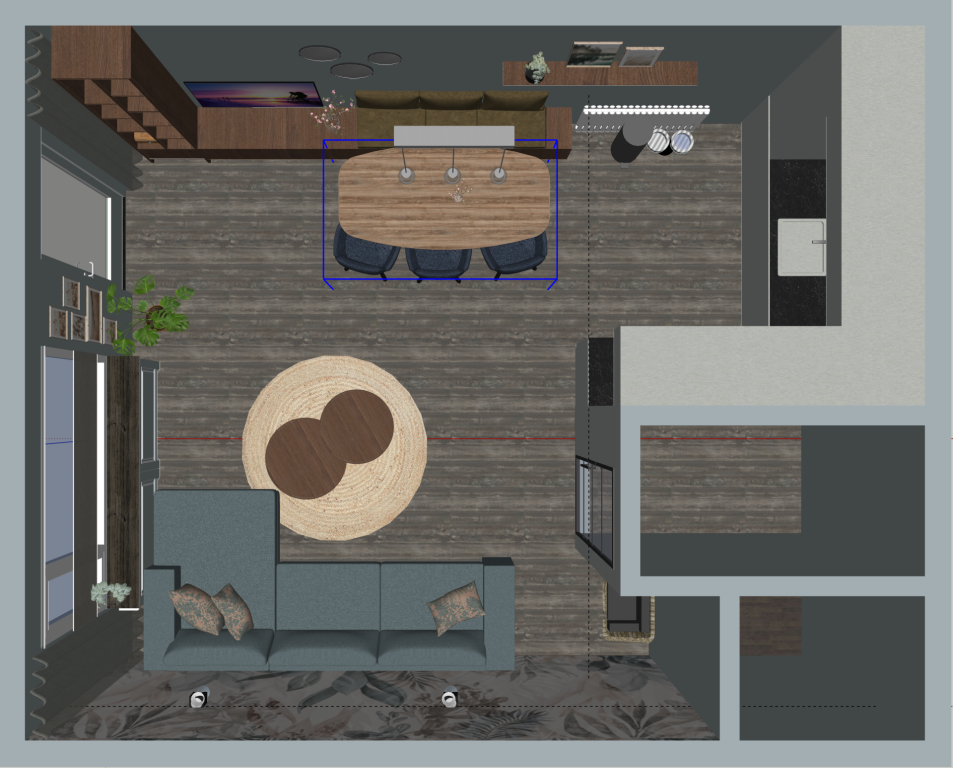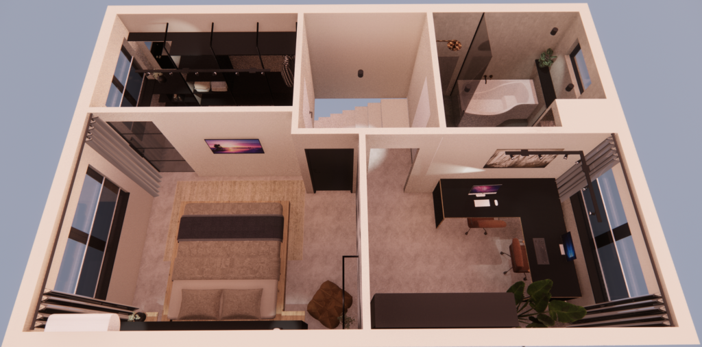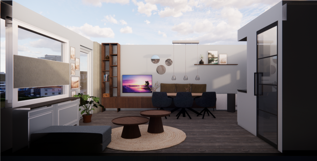 Onderstaande beelden zijn van een klant met een bijzonder appartement. Alles liep schuin, zowel het dak als de muren rondom en in de woonkamer. Een flinke uitdaging wat 3D tekenen betreft.