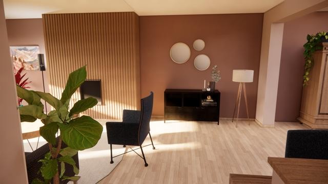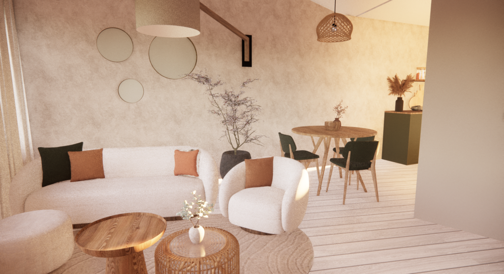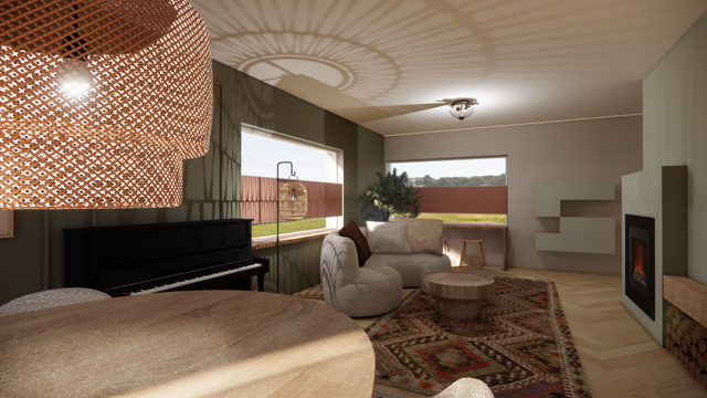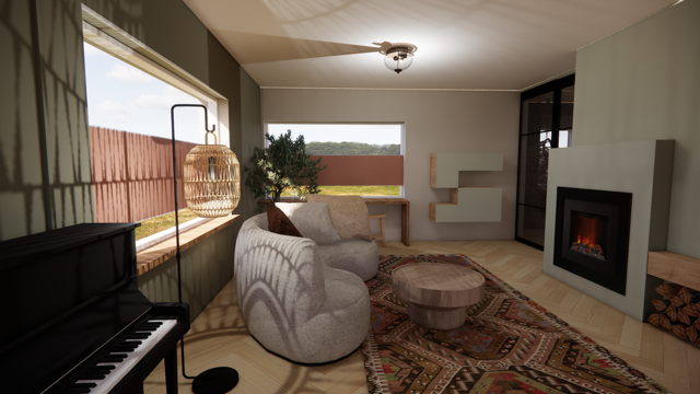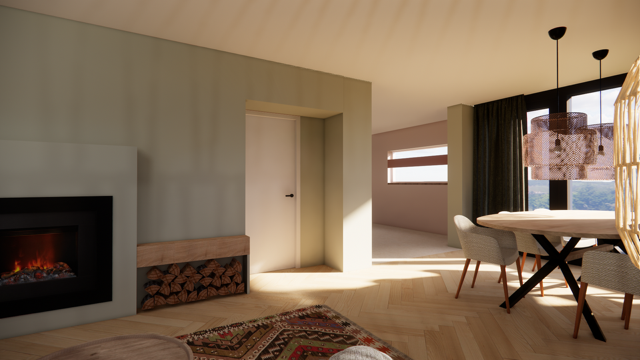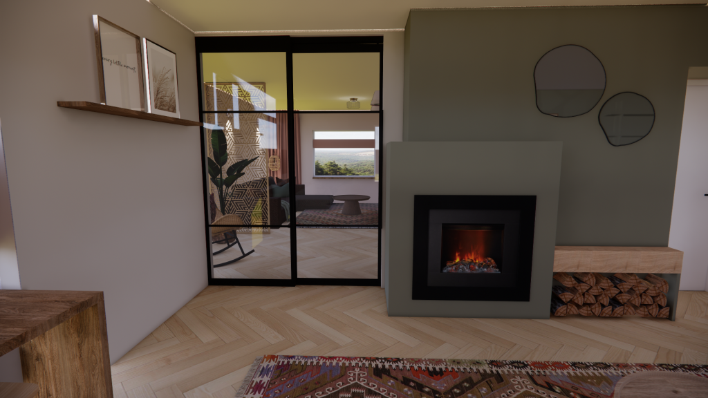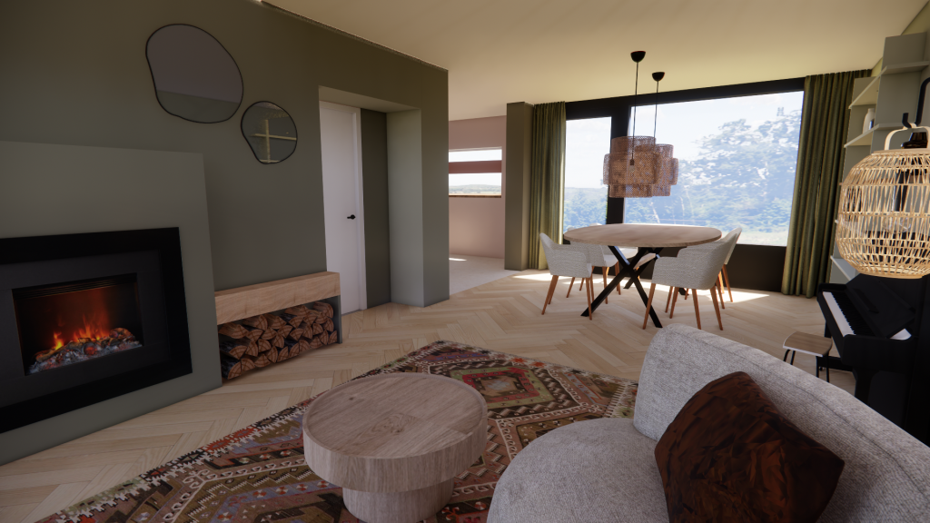 Deze gerenderde 3-Dbeelden zijn van een klant met een oude vrijstaande villa in het prachtige groene Rozendaal. Ze wensten een gezellige woonkamer, met hout en groentinten, en een natuurlijke en rustige uitstraling. De bestaande open haard mocht wat moderner, en moest het middelpunt worden van het zitgedeelte.