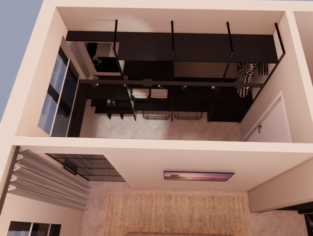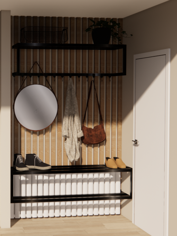 Bij de slaapkamer moest een inloopkast gerealiseerd worden, en ook wenste de klant een groot houten zwevend bed. Daarnaast wilde hij een op maat gemaakt ontwerp voor een garderobe in de hal voor de jassen en schoenen. Zijn wens daarbij was iets van staal in combinatie met hout, en iets om zijn schoenen op te plaatsen rondom de radiator.