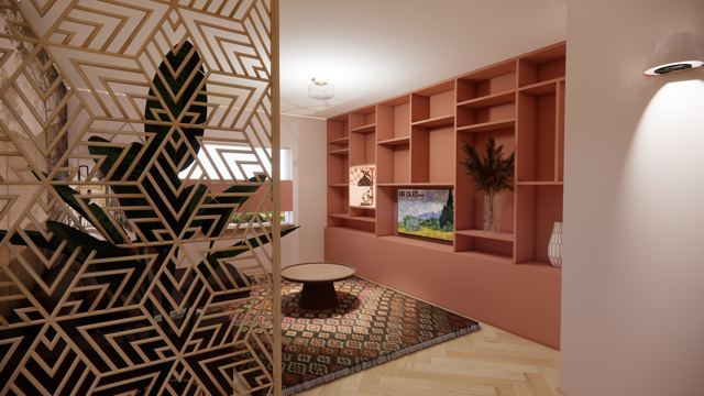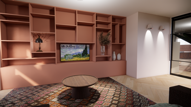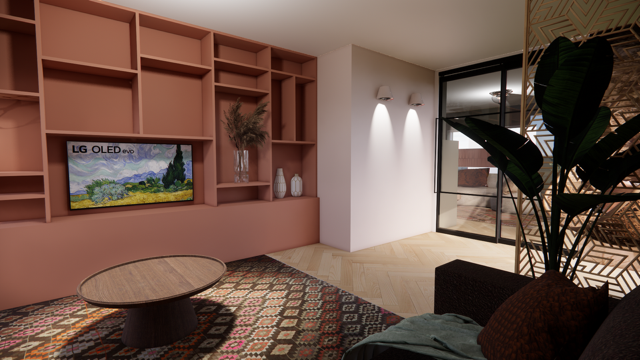 De aansluitende slaapkamer op de begane grond, moest bij de woonkamer getrokken worden, maar wel gescheiden worden d.m.v. stalen en suite deuren. Deze ruimte werd een knusse tv-kamer, in een warme Marrakesh look met de gewenste terrakleuren. Ze wilden hier graag een creatieve kastenwand waarin ook de tv moest komen.