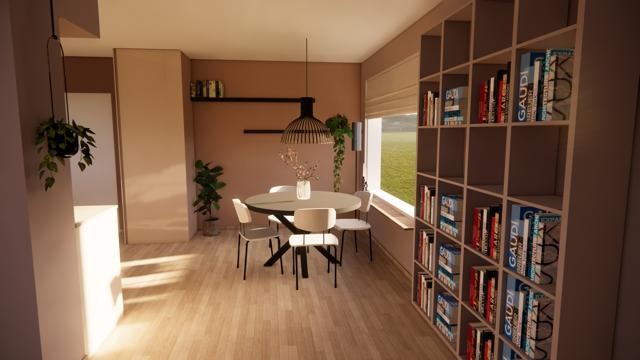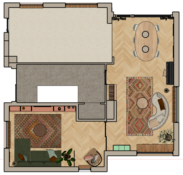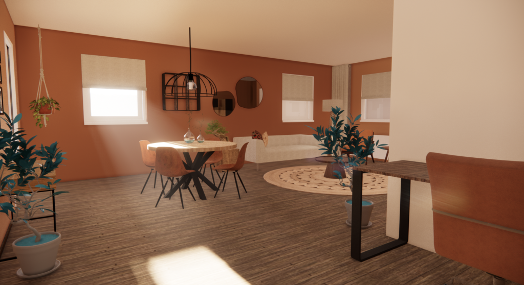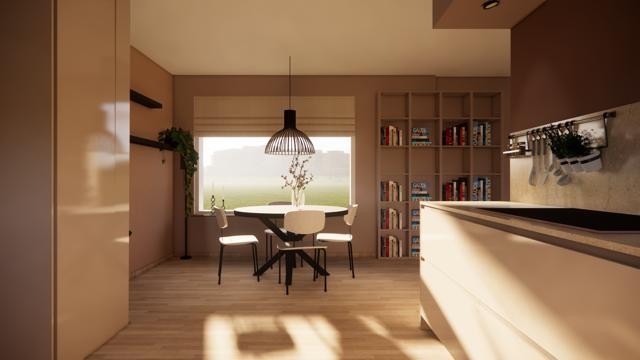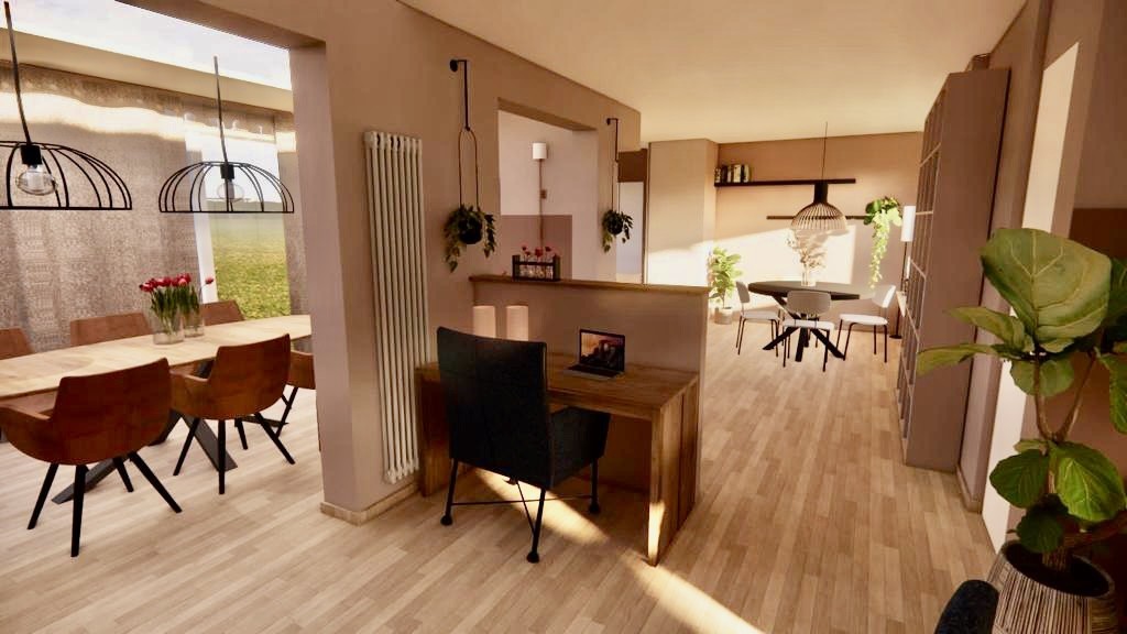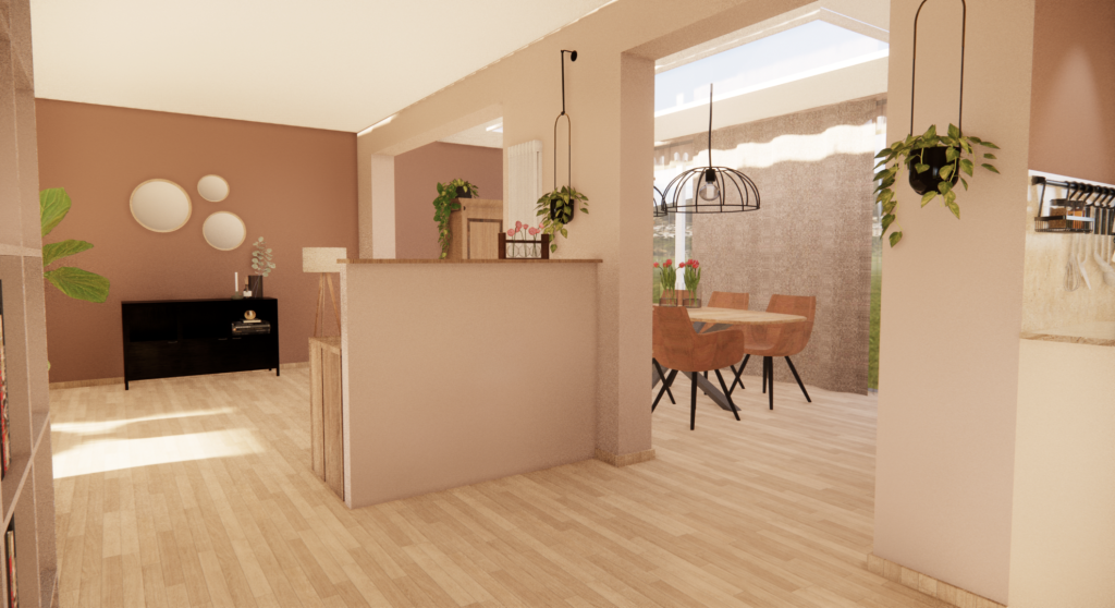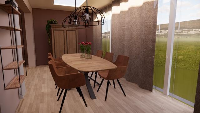 Onderstaande 3D-beelden zijn van een klant waarvoor ik de gehele benedenverdieping mocht ontwerpen. Ook moest er een aanbouw met lichtkoepel gerealiseerd worden, en een geheel nieuwe keuken.