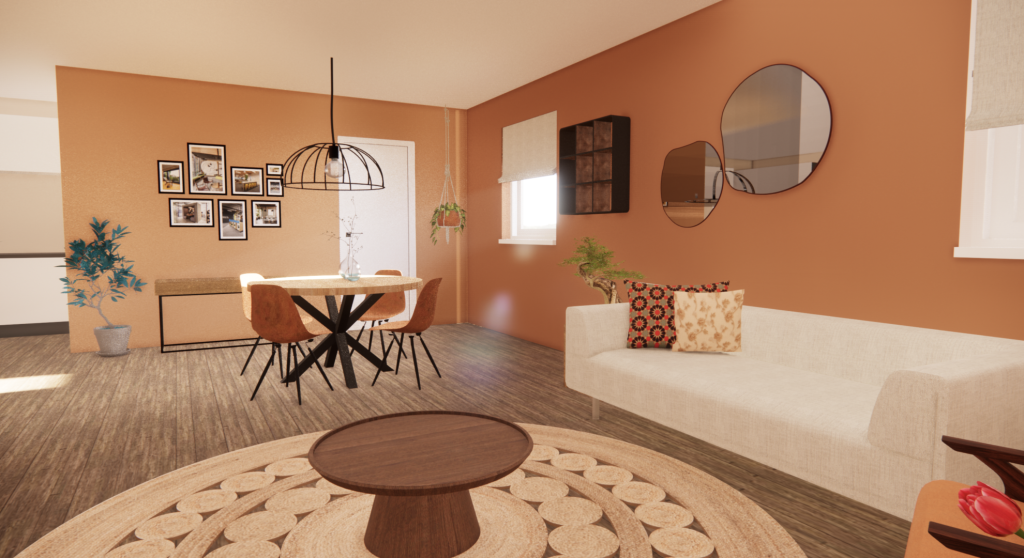 De wens was een licht interieur in een moderne Bohemienstijl met een touch of Afrika en de gewenste kleuren waren oranje en groen. Ook moest er een keukenblok bij gerealiseerd worden, omdat meneer dol was op koken, maar te weinig ruimte had in de bestaande keuken.